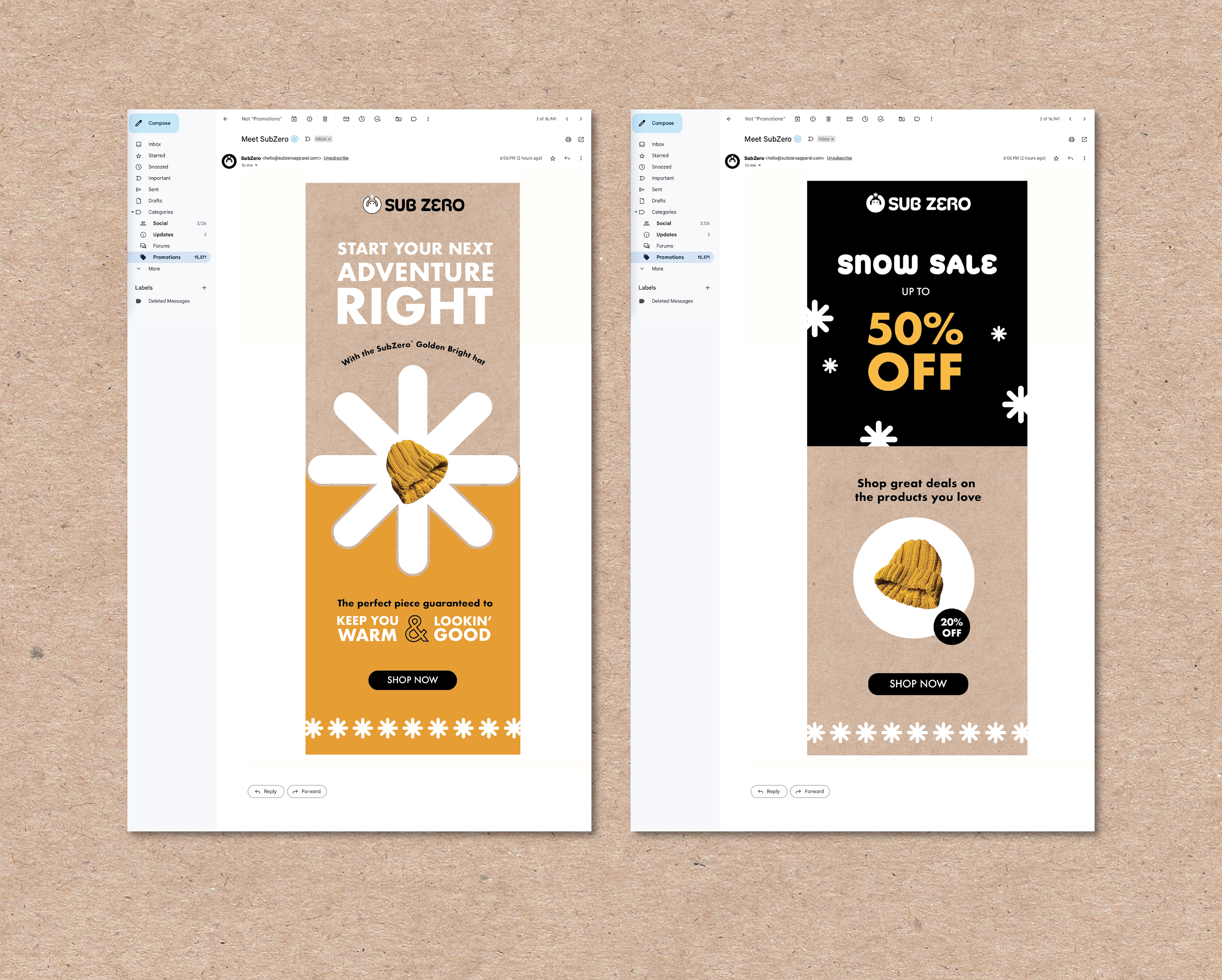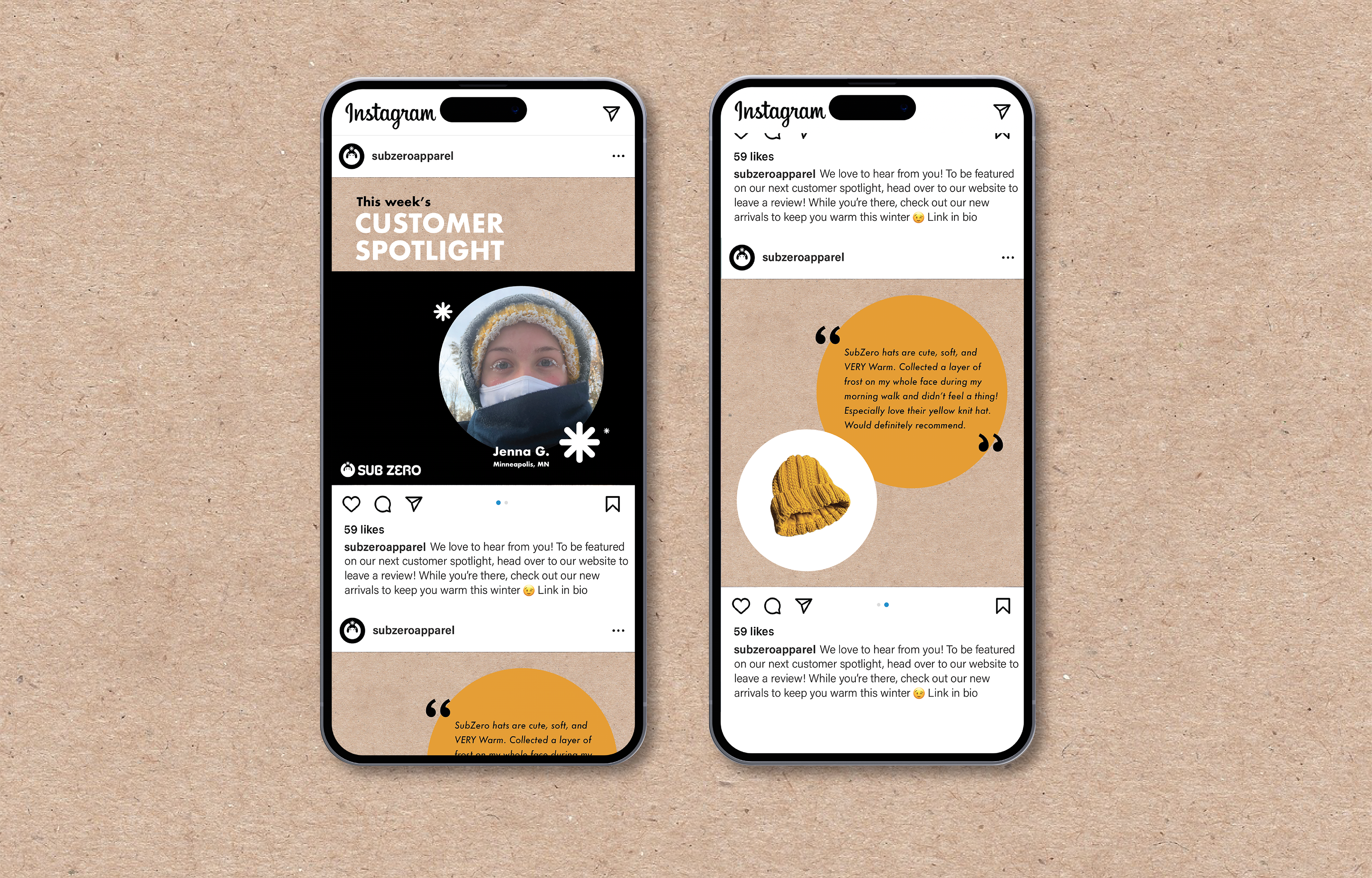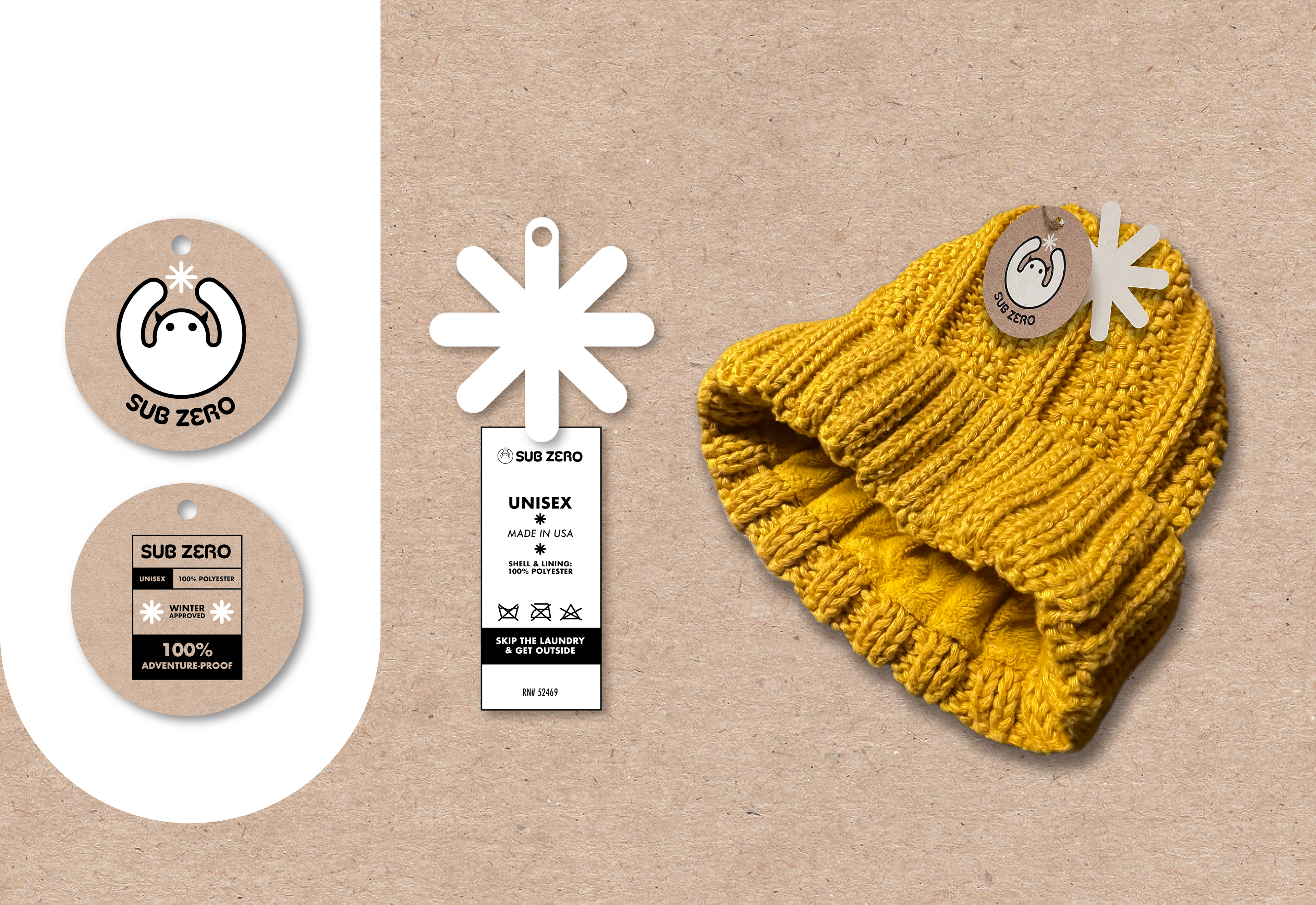 A winter apparel brand for the adventurous, SubZero's winter hats keep you warm through any activity. Includes tag designs, in-store displays, social media content, and email pushes.